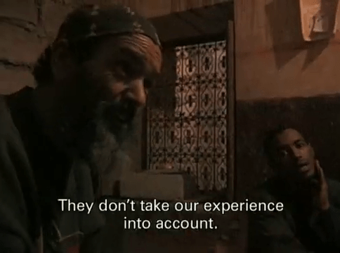 Déréaliser ces paysages, c’est aussi se les réapproprier, surtout quand on en efface les premiers ressortissants. Si, en l’occurrence, les productions des années soixante (dont beaucoup de péplums, comme Sodome et Gomorrhe de Robert Aldrich) faisaient jouer des acteurs ouarzazy, il demeurait rare que ceux-ci bénéficient de rôles signifiants (les productions étrangères préférant systématiquement leurs vedettes étrangères et leurs langues étrangères), ni même qu’ils intègrent, d’une manière plus humaine ou ouverte, l’aventure du film (comme ce fut le cas au cours du tournage d’Œdipe Roi de Pasolini). La plupart des cinéastes ont avant tout cherché à « intégrer » la population locale comme silhouettes, comme figurants, comme corps, pour faire de l’ambiance ou du remplissage (ce qui désormais tend à se faire aussi numériquement). La plupart de ces extras se confronte à une hiérarchie et une opacité qui les met à distance de la création. Demeurent donc leur trace dans un coin d’image, d’entre ces visages sur lesquels on ne s’attarde quasiment jamais (comme dirait Saïd, « étrangers sur leur propre terre »). La dimension coloniale de cette mission civilisatrice consistant à raconter le passé et le futur (stricto sensu « à la place de ») est évidemment criante.