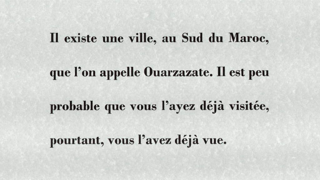 Il existe une ville, au Sud du Maroc, que l’on connaît sans connaître ; une ville que l’on appelle Ouarzazate. Malgré les nombreuses images que nous avons pu en voir, nous n’en avons pas forcément remarqué les monuments d’architecture bèrbère (la kasbah de Taourirt au sein-même de la ville, et non loin dans la province, la kasbah de Tifoultoute puis le ksar d’Aït Ben Haddou), ni les paysages, les reliefs, et encore moins les innombrables décors de cinéma qui se sont superposés, numériquement et physiquement, aux architectures historiques de la ville. Nous n’avons pas forcément remarqué la réalité qui les liait, et il semblerait même que celle-ci commence à disparaître sous les édifices imaginaires, interprétée comme vestiges, signes et archives par le tourisme de masse, fasciné par d’autres territoires (fictifs ou biofictifs, entourant les carcasses de temps semble-t-il révolus).