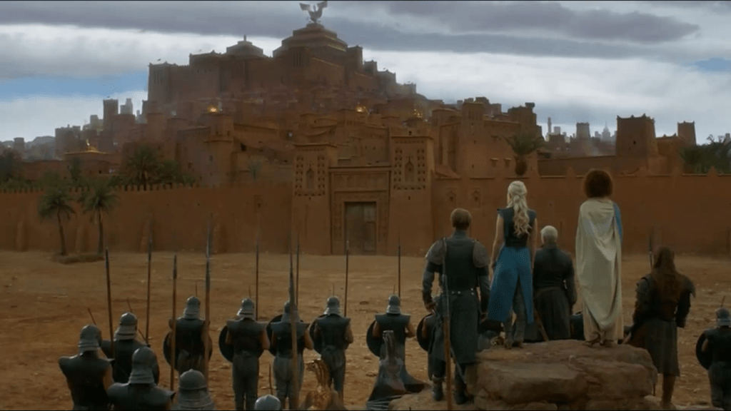 Même quand ils ne se situent pas dans un présent relatif (celui des XIXe, XXe et XXI siècles), les récits portés par l’industrie cinématographique dominante continuent à représenter les cultures d’Afrique du Nord et d’Asie de l’Ouest comme un tout « oriental », un ensemble de contrées aux terres riches et aux peuples communément « exotiques », souvent menacés ou soumis à l’exercice de forces « barbares » ou tyranniques (qui donc « justifieraient » un interventionnisme colonial). Les traits bèrbères des architectures ouarzazy semblent souvent avoir peu de conséquence pour les histoires qui s’y tournent. Ce refus du discernement fait partie processus même du fantasme et de l’assignation. Le « monde Arabe » peut ainsi devenir ce théâtre aux reliefs interchangeables où se déploie l’imaginaire complexe occidental de ce qu’est « l’Orient ». Godard le rappelait dans Le Livre d’image : « les Arabes n’intéressent pas “le monde”. Les musulmans non plus. Si l’islam retient politiquement l’attention, le “monde arabe” est décor et paysage. Le monde arabe, s’il existe en tant que monde, n’est jamais regardé en tant que tel. » Ces paysages du Maroc, de Tunisie (Occitane Lacurie fait rapidement le lien avec les lieux de tournage de Star Wars), comme ceux d’autres pays encore, deviennent indistinctement les cadres de récits sur des civilisations originelles, sur l’époque du Christ, l’Egypte antique ou l’’époque coloniale moderne, où peuvent se mettre en scène un désert dangereux, sublime et fascinant, un palais habité de secrets ou de désirs, un Moyen-Âge brut et fantasmé ou encore un futur aussi lointain qu’emprunt de mystique.