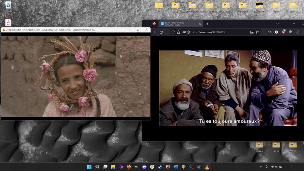 « Il y a un réel contraste entre la violence de l’acte de représenter et le calme intérieur de la représentation elle-même. » rappelle Jean-Luc Godard dans Le Livre d’image, film pour lequel il eut à contrer l’hégémonie des images américaines et européennes à travers le montage et la présentation de films tunisiens et maghrébins (entre autres) qu’il lui fallut parfois trouver aux moyens du piratage (avec l’aide de son entourage). Un revers est pris à cette introuvabilité très relative dans la façon dont Occitane Lacurie partage sur son écran, dans Starouarzazate, des versions pirates des films de Villeneuve ou de Pasolini et une version légale, confiée via vimeo, du film de Daoud Aoulad-Syad, En attendant Pasolini (2007).